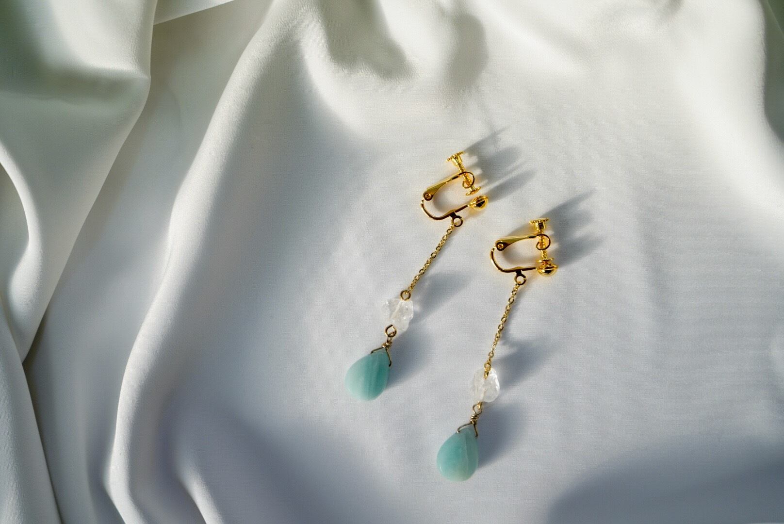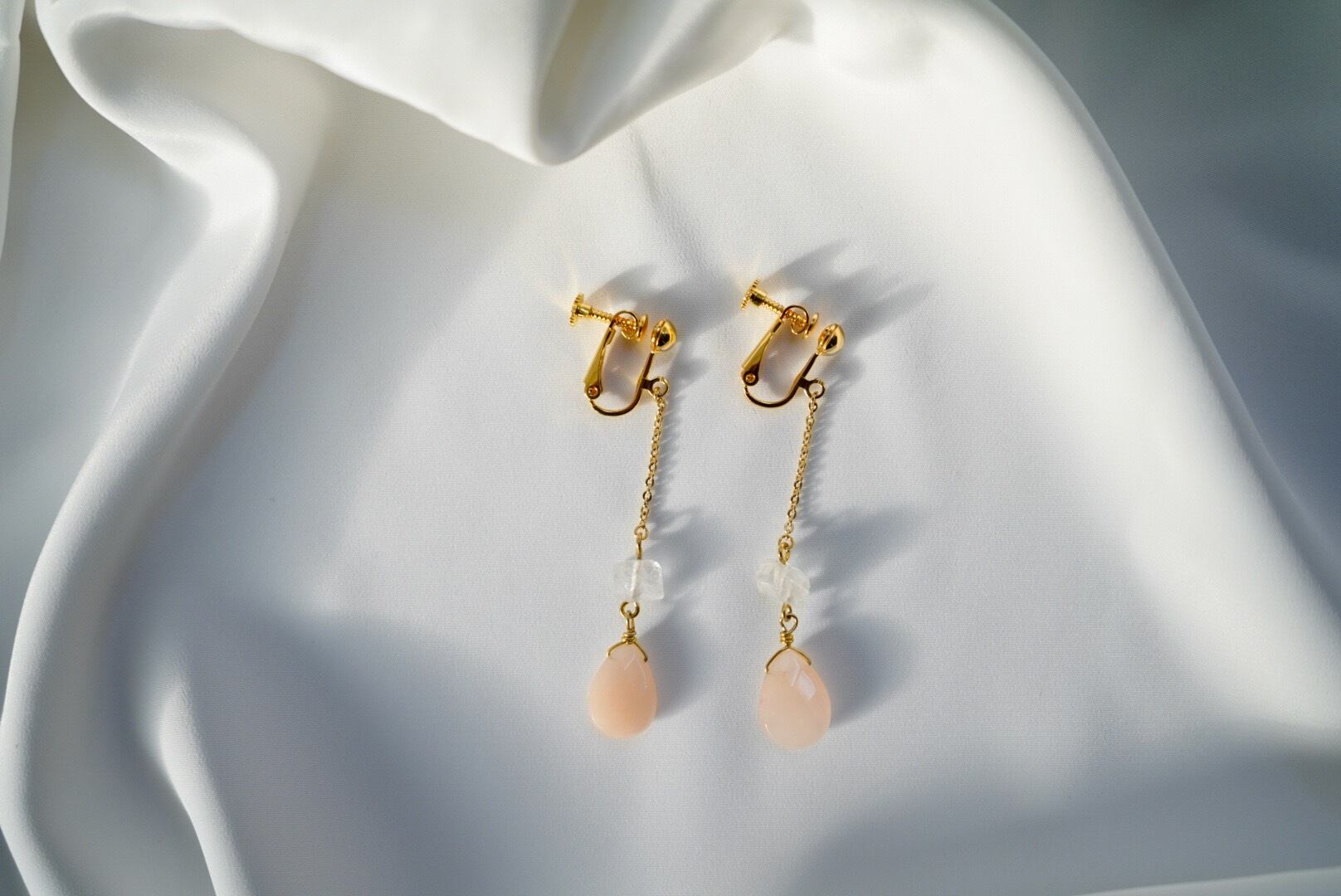クリスタルとピンクアベンチュリン、アマゾナイトを合わせたドロップ型のイヤリング。パワーストーンとして2種類の天然石を合わせることでリラックス効果があり運気を高めてくれます。無料でピアスへの変更が可能です。